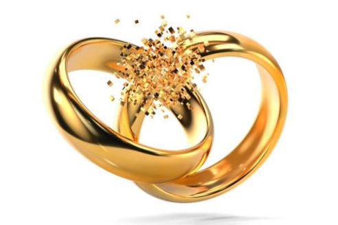 Broken gold wedding rings as divorce symbol isolated on white background (3d render)