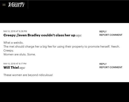 One viewer wrote on Variety‘s comments wall, “The Met should charge [Gaga] a big fee for using their property to promote herself. Yeech. Creepy. Women are sluts. Some.”