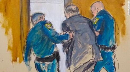 A courtroom sketch of Harvey Weinstein being handcuffed and taken away to await sentencing.
