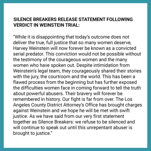 In an open letter, several of Weinstein’s victims and silence breakers – including Ashley Judd, Rosanna Arquette and Zoe Brock – expressed that while it is disappointing today’s outcome has not delivered full justice, it is appreciated that the fallen film mogul will forever be known as a convicted serial predator.