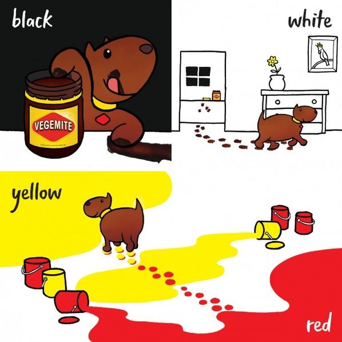 The very first page of Colours features the puppy sticking his paws into a jar of Vegemite, then leaving tracks of the black stuff all over the house. The book also gives priority space to the hues that make up the Vegemite brand: black, yellow and red.