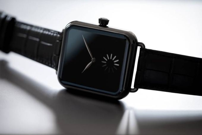The Moser & Cie watch sports the same rectangular shape of Apple’s smartwatch and now boasts a pair of hands to help tell the time, not just notification noises.