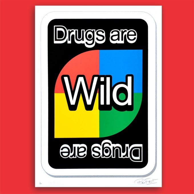 Freshly unveiled today were four colour variants of Frost’s new screen print ‘Draw Four’, inspired by the very familiar card game but with a blatant drug reference thrown in for good measure.