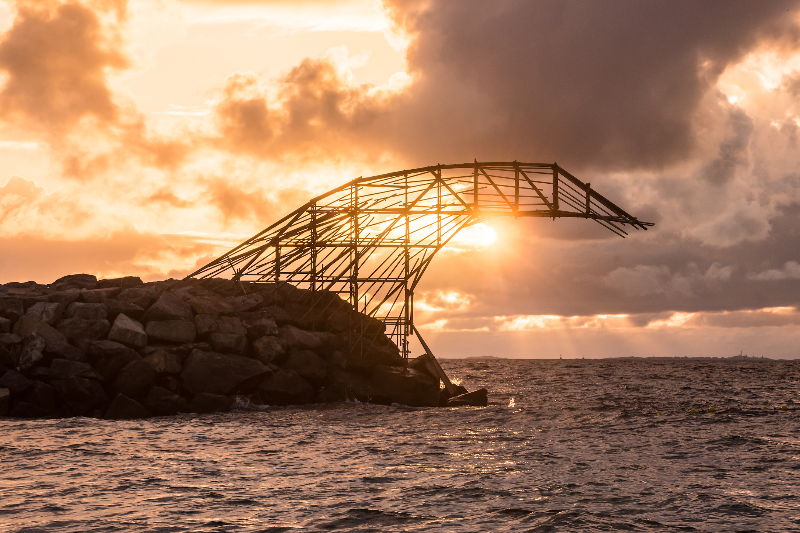 Looming over the end of the groyne on Cottesloe Beach with a powerful presence, Taylor’s 8m-high sculpture, ‘Structural Wave’, is made of scaffold and weighs approximately six tonnes.