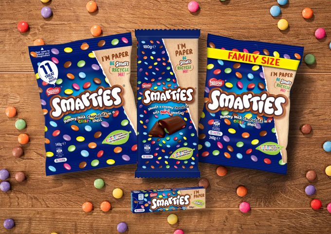 The change is part of a global move, making Smarties the first global confectionery brand entirely sold in recyclable paper packaging, removing approximately 250 million plastic packs sold globally every year.