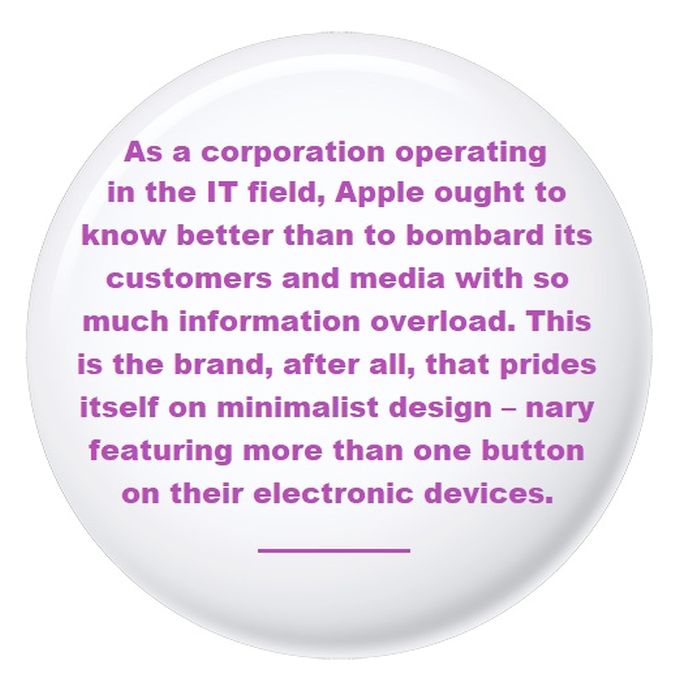 As a corporation operating in the IT field, Apple ought to know better than to bombard its customers and media with so much information overload. This is the brand, after all, that prides itself on minimalist design – nary featuring more than one button on their electronic devices. It may make spoilt-for-choice millennials happy – who practically came out of the womb with an iPhone in their hand – but the rest of us old-school folk are scratching our heads wondering how the fuck are we supposed to go online for instructions to set up the gizmo if we don’t know how to turn the fucker on in the first place?