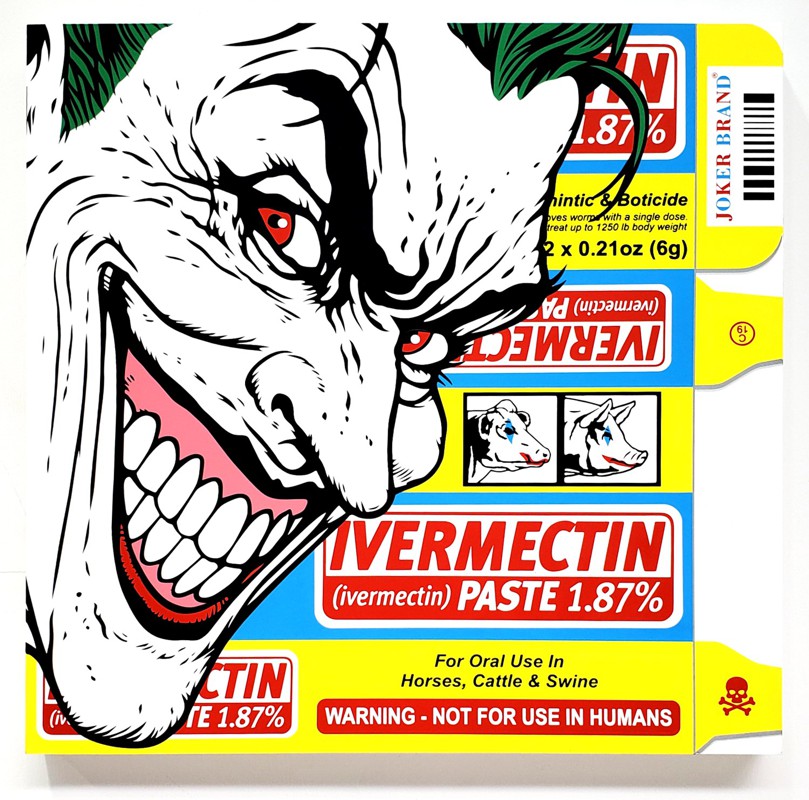 The week sees the release of a five-piece ‘Joker Brand’ series featuring DC Comics’ original Joker emblazoned over large painted packets of Ivermectin.