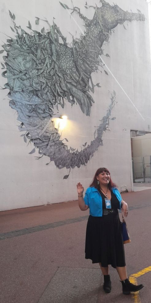 Immediately we are given an art lesson: the meaning behind the digital tower and how it pays tribute to the swamp land that used to be here and to its traditional custodians, the Whadjuk Noongar people.