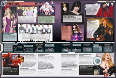 Something a little different this year is the presentation of more double page profiles on prominent sports stars and record-breaking players. Featured are the likes of footballer Cristiano Ronaldo, Paralympian Ellie Simmonds, music megastar Beyoncé, and Most Tattooed Man Lucky Diamond Rich. (Incidentally, Beyonce broke the record for being the first act to debut at number 1 on the US music charts with her first six studio albums).