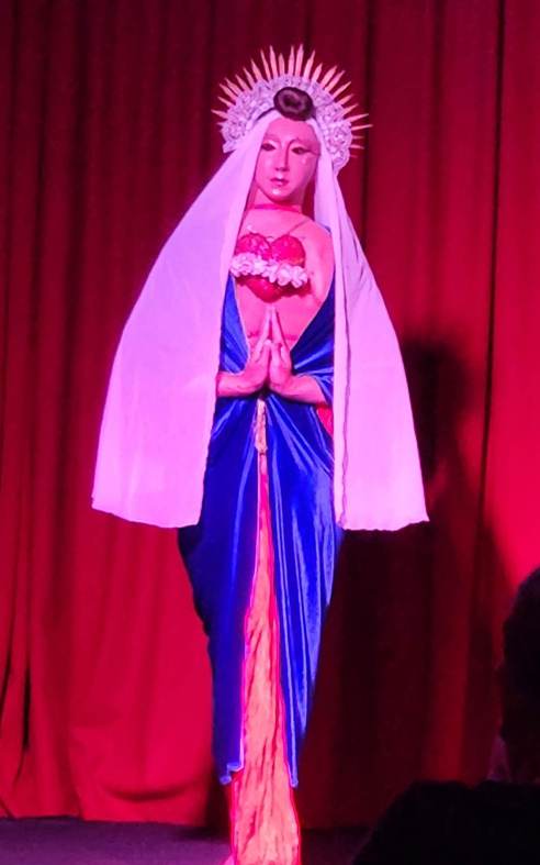 A woman is standing on stage, facing the audience in what looks like a plastic mask; she has a crown of thorns on her head and a large heart on her chest. She looks like a kinda kabuki version of the Virgin Mary only the woman is standing backwards and the audience has been fooled she’s facing frontwards; soon she reveals all in a sultry striptease.