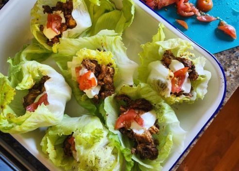 Break the lettuce into single leaves, then layer three similar sized leaves on top of each other to create eight lettuce cup bases. Distribute the chicken evenly between the lettuce cups, then drizzle with the yoghurt and top with the diced cherry tomato. Season well with salt and pepper and serve. Store leftovers in an airtight container in the fridge and enjoy for lunch or dinner the next day.
