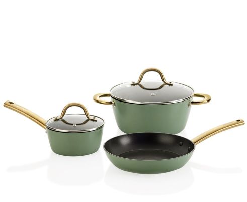 ↑ WHAT: Wiltshire Easycook Basil and Gold Non-Stick Cookware. DESCRIPTION: Match the festive season to your cookware with the Wiltshire Easycook basil and gold aluminium non-stick 3-piece set, ideal for all cooking needs.