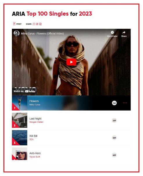 Other artists that featured prominently in the end-of-year charts were Miley Cyrus (examples: Flowers at number one, and Party In The USA at 69); Post Bloody Malone (egs: Circles and Chemical); Morgan Wallen (Wasted On You, and Last Night); SZA; PinkPantheress; The Weeknd; and everybody’s favourite normie Ed Sheeran.