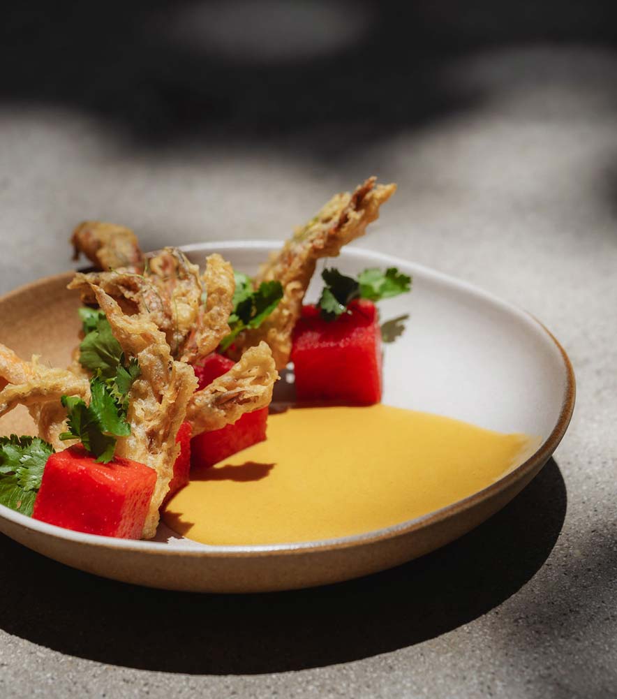 Stepping into Kilo Kitchen’s second Bali establishment, which is situated in the heart of Pererenan, you’ll first notice the street art that hangs off the left main wall, kind of hinting at the street-smart hawkers’ menu tasting experience to come. At the other end of the restaurant, the décor is more pared back, and together these two styles of design represent the classic-meets-street aesthetic of Kilo Kitchen’s menu.