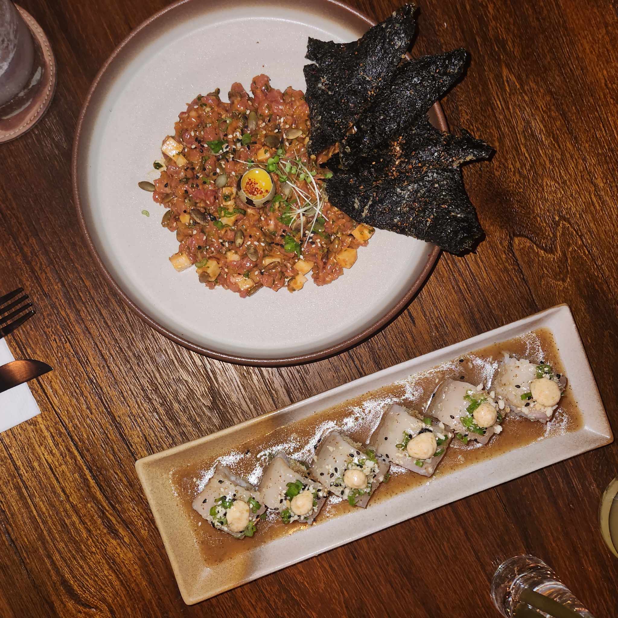 Steak Tartare (at top) and Truffled Tai Yuzu Roll, the latter a Kilo Kitchen staple.