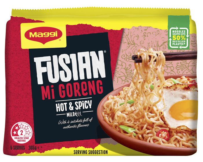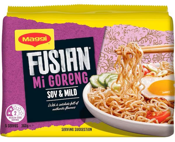Maggie two-minute noodles in Fusion Mi Goreng and Vegemite flavours are now available from Coles and Woolworths in 5x 65gram packets for $5.