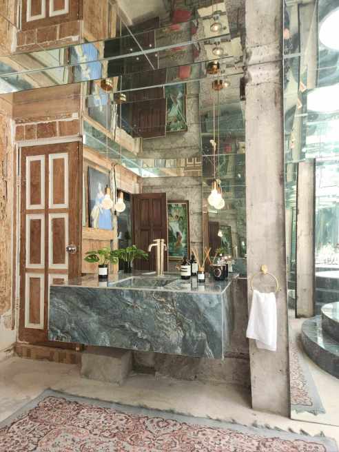To one side of the lobby is a communal bathroom that would have made Marie Antoinette feel right at home. It’s the perfect spot to touch up the lippy before that Insta photo session. Here, a Louis XVII-style accent chair sits opposite a porcelain toilet, gold tap fixtures glint in competition with brass light fittings… you get the decadent picture.