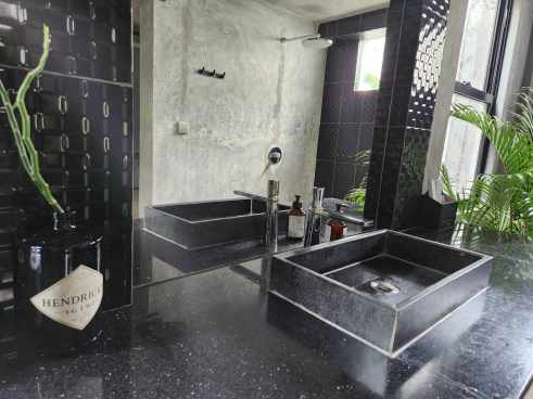 What I really liked about the Miyake room was the bathroom – so big, and half of it is just shower space. Like the ‘Middle Italy’ room, the bathroom is semi-outdoors and by that I mean there is sheer sheet for a ceiling that lets in the natural sunlight. Recycled Hendricks Gin bottles hold bamboo plants while palm plants fill the other corners of the en suite.