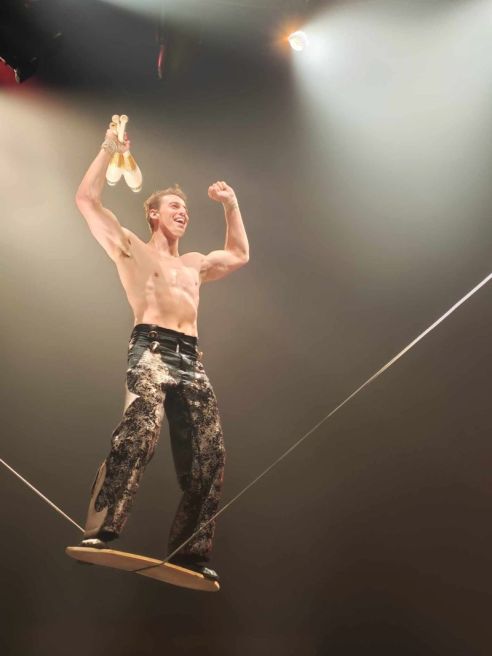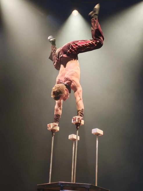 There’s acrobat and aerialist Merrik Ashton – the brainchild behind the show (more on him later), who plays Flex, a well-fit acrobat who delivers cunning moves on the thinnest of trapeze wire. Then there’s his mate, Ace (aka: Ian Richardson), one of Australia’s premier hand-balancing performers, who will have you at the edge of your seat as he balances precariously on short stilts while platformed several metres in the air.