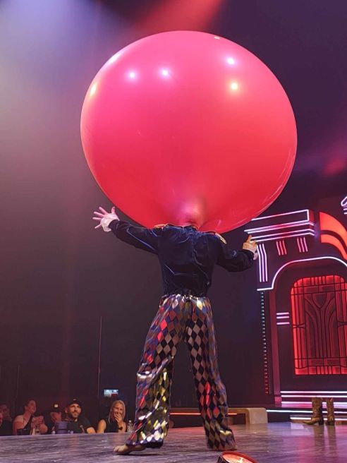 Punky starts off by using an everyday balloon pump to fill his key prop with air… and it gets bigger, and bigger, and bigger, until he is able to – wait for it – fit his head inside the nozzle, eventually actually making his full way into the giant balloon. The insanity of it is so difficult to describe that I have video-ed it for you. Suffice to say, this stunt is hilarious and one of the most outrageous things I’ve ever seen on a Fringe stage: