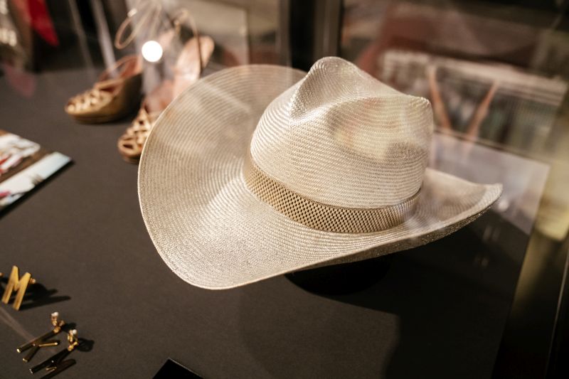 Included in the display is a multicoloured sequined bodysuit designed by Ian McMaugh, worn during the Enjoy Yourself tour (1990), the mugshot identification board for ‘Indie Kylie’ in the video for ‘Did It Again’ (1997) and her Azzedine Alaïa designed shoes worn in the music video for ‘Chocolate’ (2004). Also on display is the Stephen Jones designed cowboy hat worn to promote the single ‘Cowboy Style’ (1997) plus a selection of her signature Dolce & Gabbana jewellery worn during the KylieFever 2002 tour.
