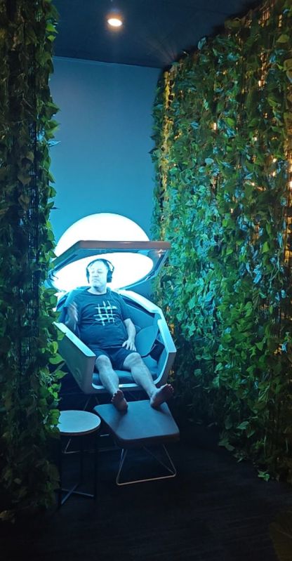 From an infrared sauna and personal infrared lighting booth, to massage chairs and meditation pods, this place looks like a scene out of 2001 Space Odyssey and, once you have headphones on in the meditation pod, for example, feels like you’re out in space, too.