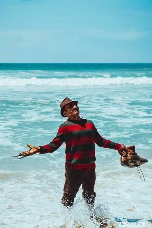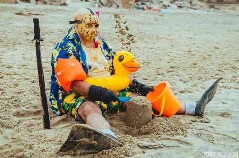 With Halloween now on our doorstep, and summer up next on Australia’s seasonal agenda, this unlikely pairing of beachwear and horror masks seemed just about right. Or really, really wrong, depending on your tastes.