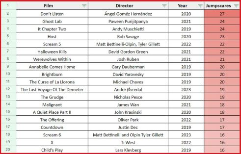 Interesting to note, BonusFinder.com’s research uncovered that the rate of jump scares appears to have decreased over the years, with no films from 2023 making the top 10.