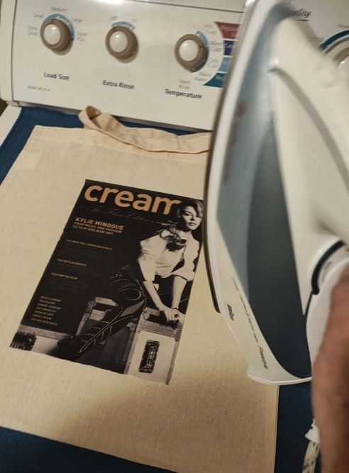First I wanted to look at t-shirt designing and to see if the transfer quality of Cricut’s ‘Smart Iron-On’ vinyl sheets were of high standard. This wasn’t to be a design about shape but about bold and balanced contrast and precision. So I took the cover of Cream magazine featuring Kylie Minogue in monochrome – looking sharp, serious and spunky as ever and cropped it to suitable size for a tote.