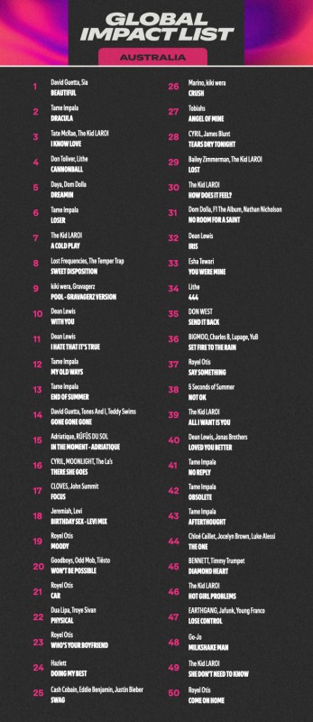Spotify Australia has today unveiled its Australian Music Global Impact List, covering the full calendar year for 2025, and for the first time, the list has expanded to recognise the Top 50 tracks from local artists with the biggest global impact on Spotify – outside of Australia.