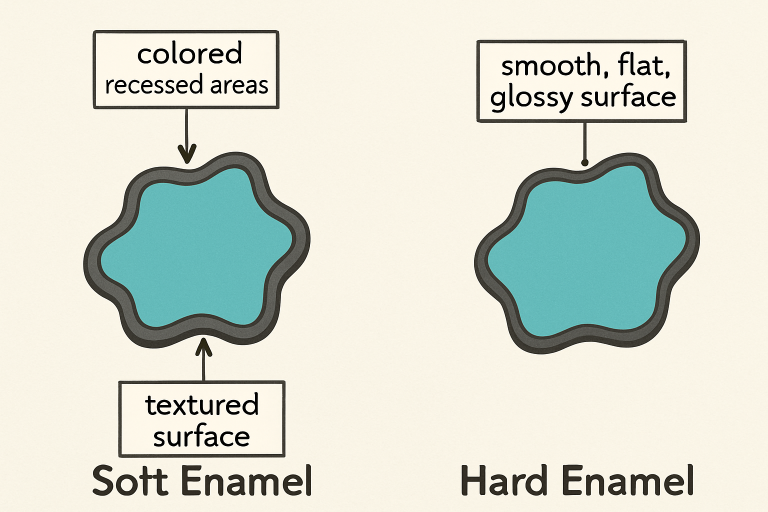 - Surface Texture: Soft enamel gives a dimensional texture, while hard enamel provides a flat, glass-like finish.